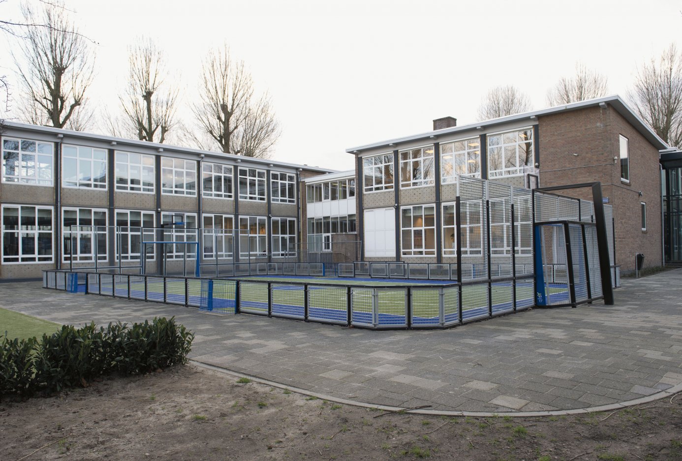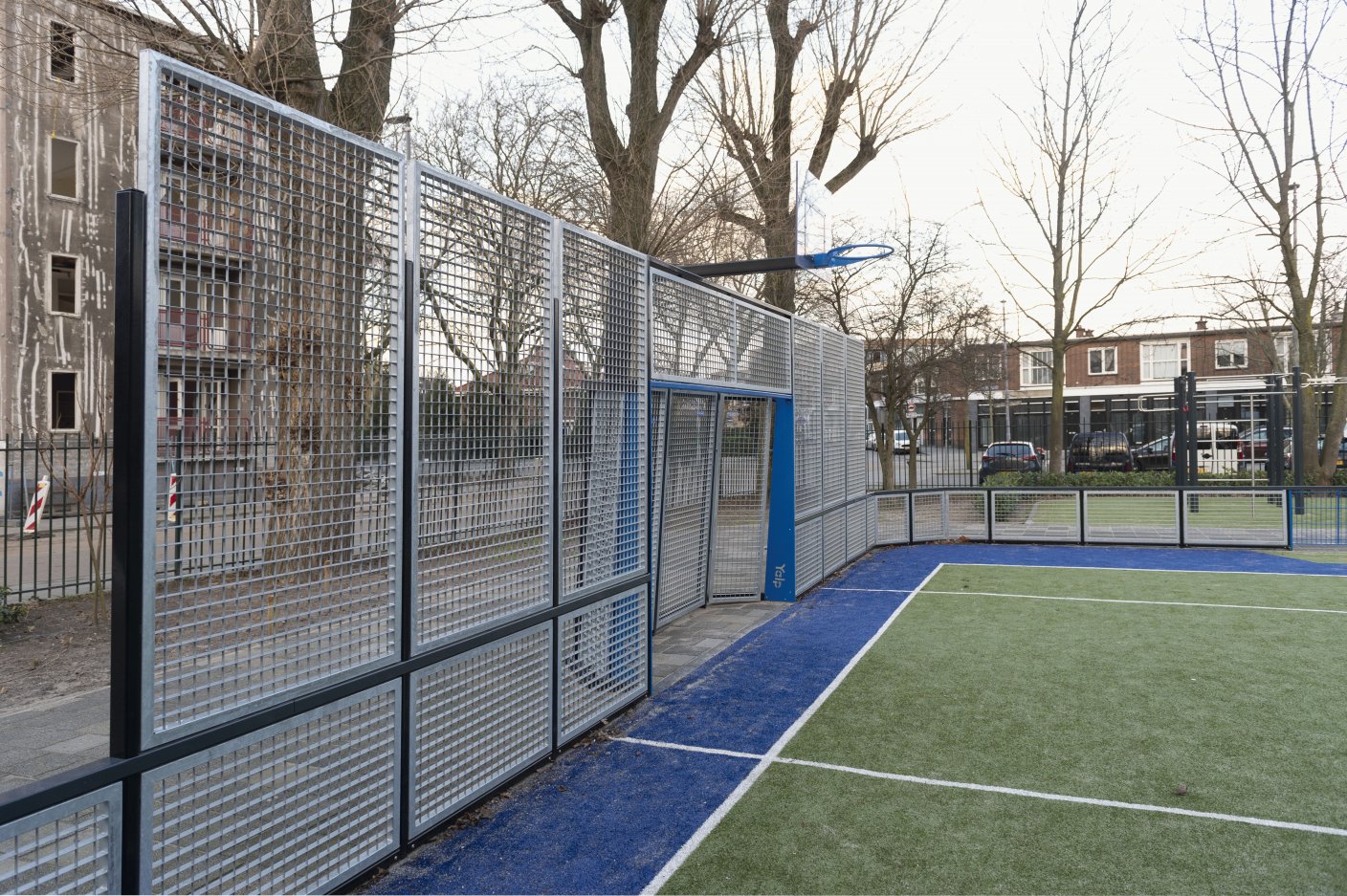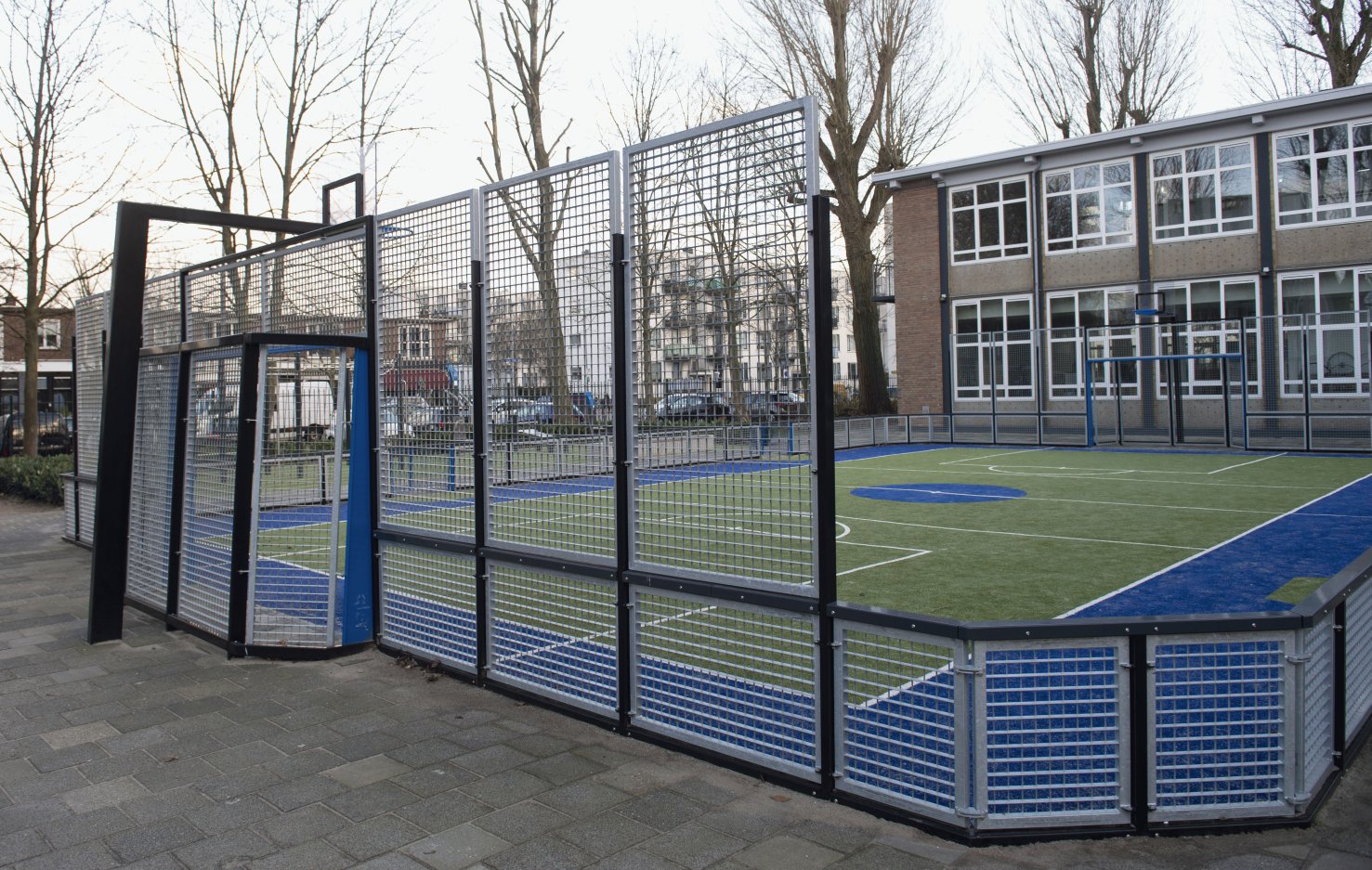 Dejo roosters zijn ideaal om toe te passen in publieke ruimtes, zoals een speelveld of pannakooi. De voordelen op een rijtje: dejoroosters zijn robuust en kunnen tegen een stootje, dejoroosters zijn niet gewild om graffiti op te spuiten, dejo roosters zijn bestand tegen brand en roesten niet. Kortom, “hufterproof” met een lange levensduur. In deze toepassing is gekozen voor grote mazen 50x50 voor maximale doorkijk.